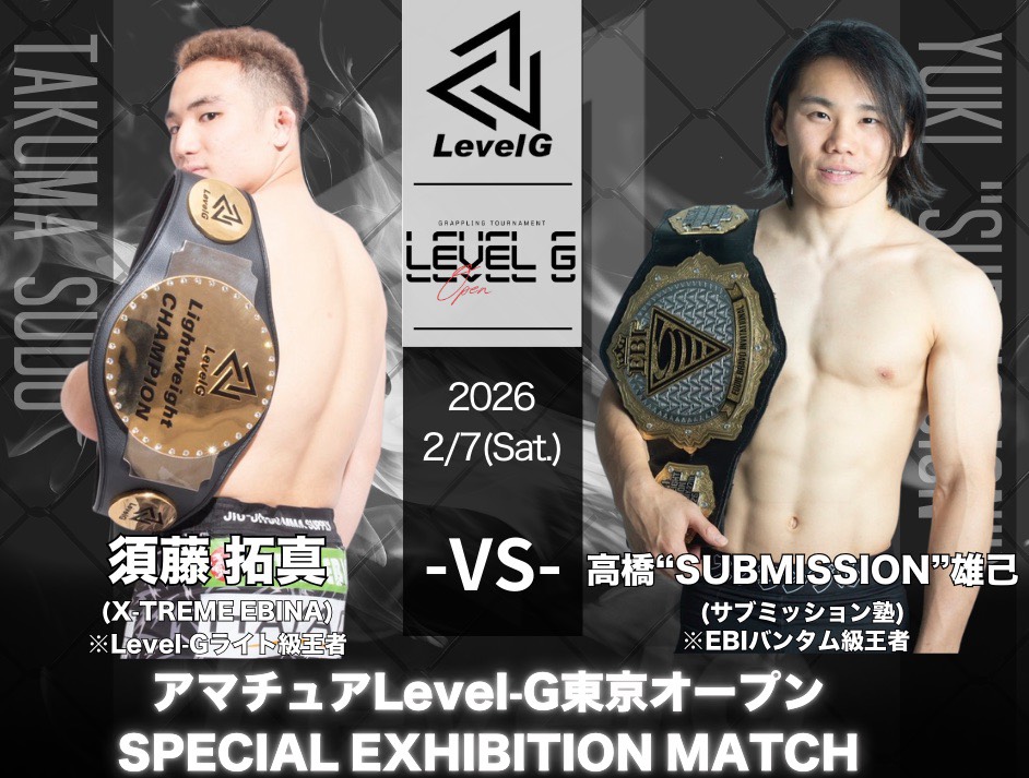 大会参加者特典として、大会終了後に高橋“SUBMISSION”雄己とLevel-G王者・須藤拓真によるエキシビジョンマッチを行います。